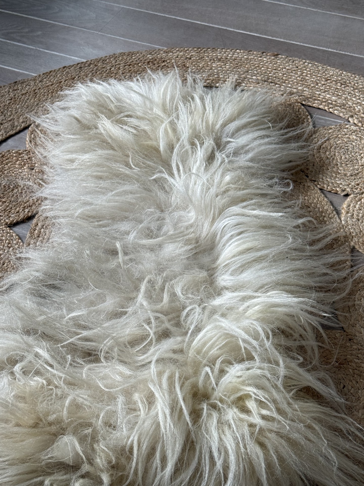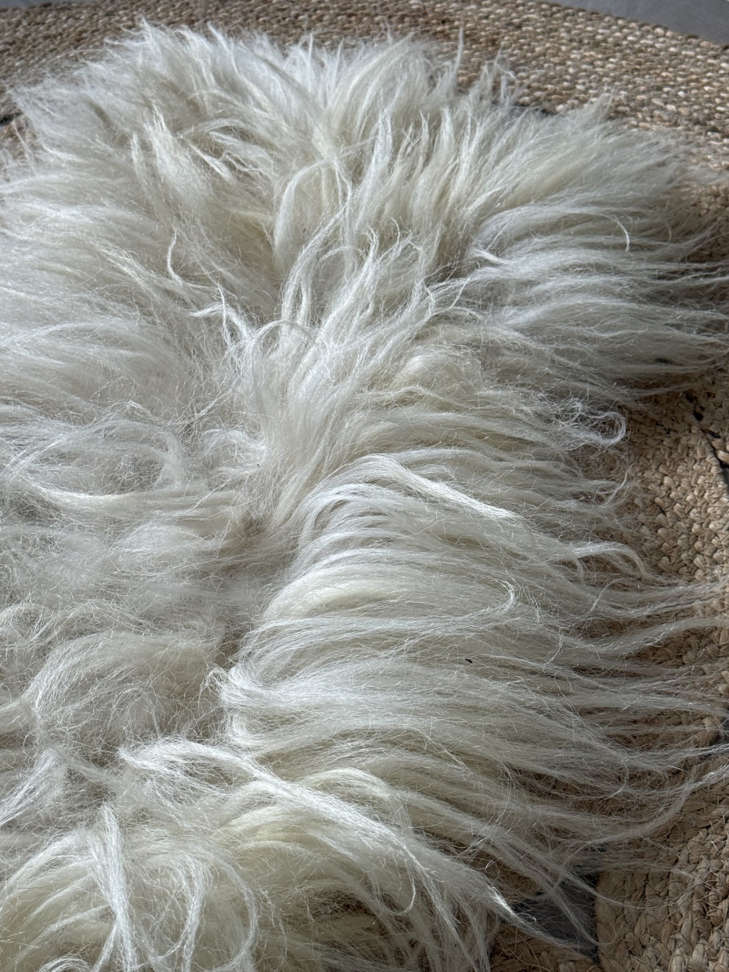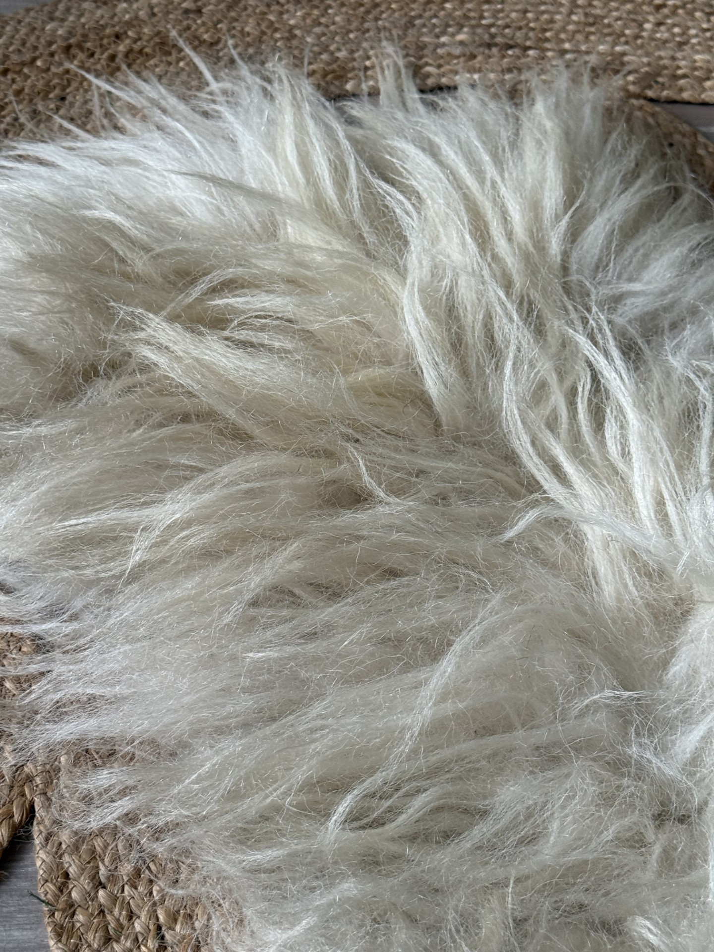Een room wit Schoonebekervacht van 100 x 50 cm. Super leuk om mee te decoreren op bijv. de rugleuning van de bank. Maar ook op een krukje, tafel of houten bankje zal deze vacht het goed doen.