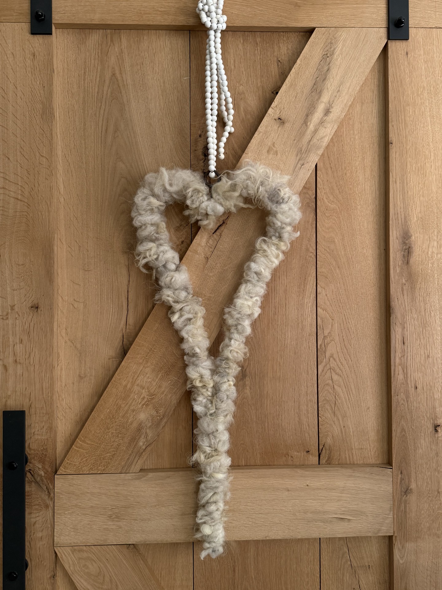 Super gaaf wollig hart. IJzeren frame gebonden met gewassen crème wol. Lengte van het hart is 75 cm. Leuk om cadeau te geven! Het hart heeft een oog om aan op te hangen. Liever een groter formaat? Op bestelling is er een XL hart verkrijgbaar van 130 cm.
