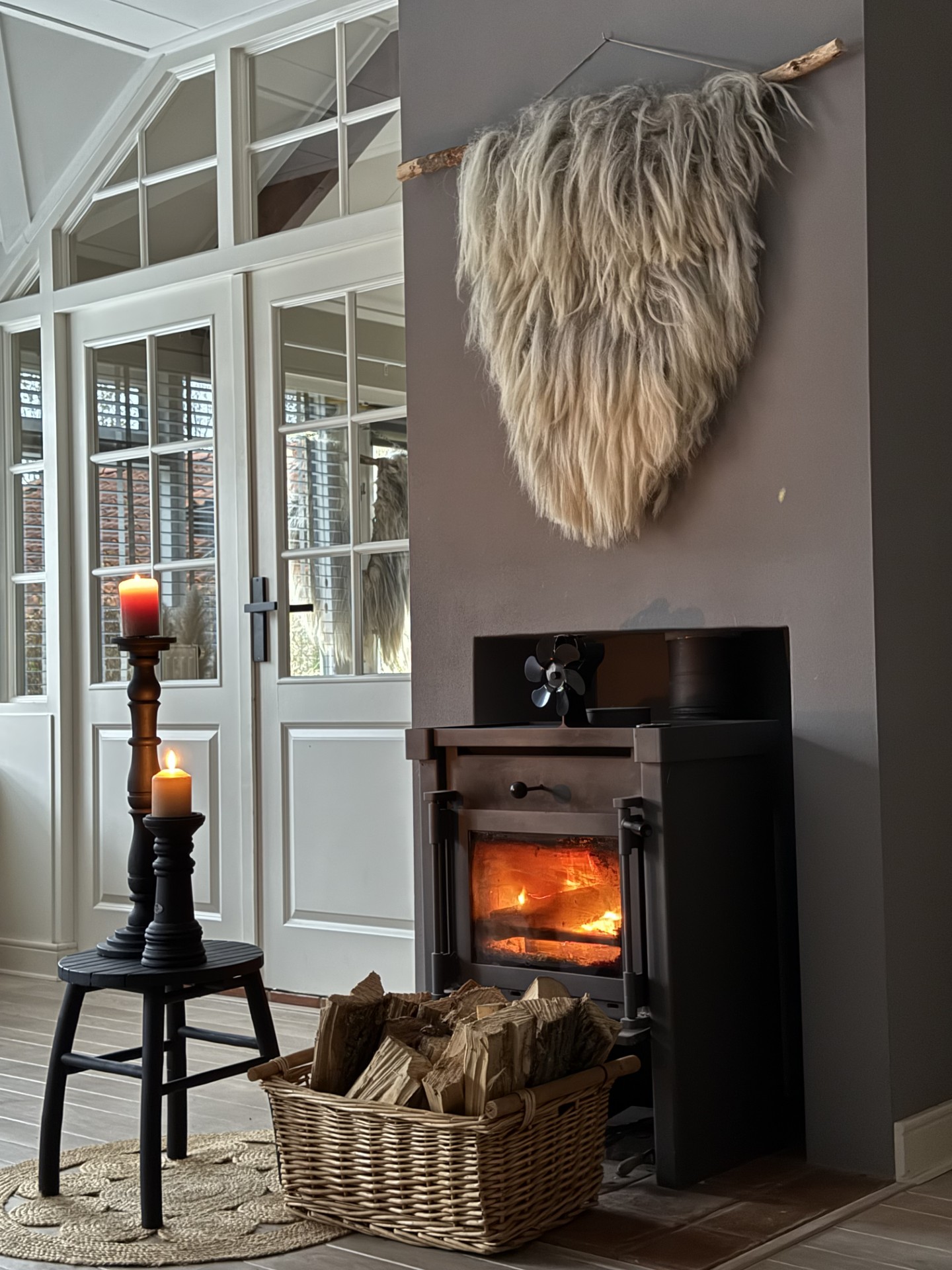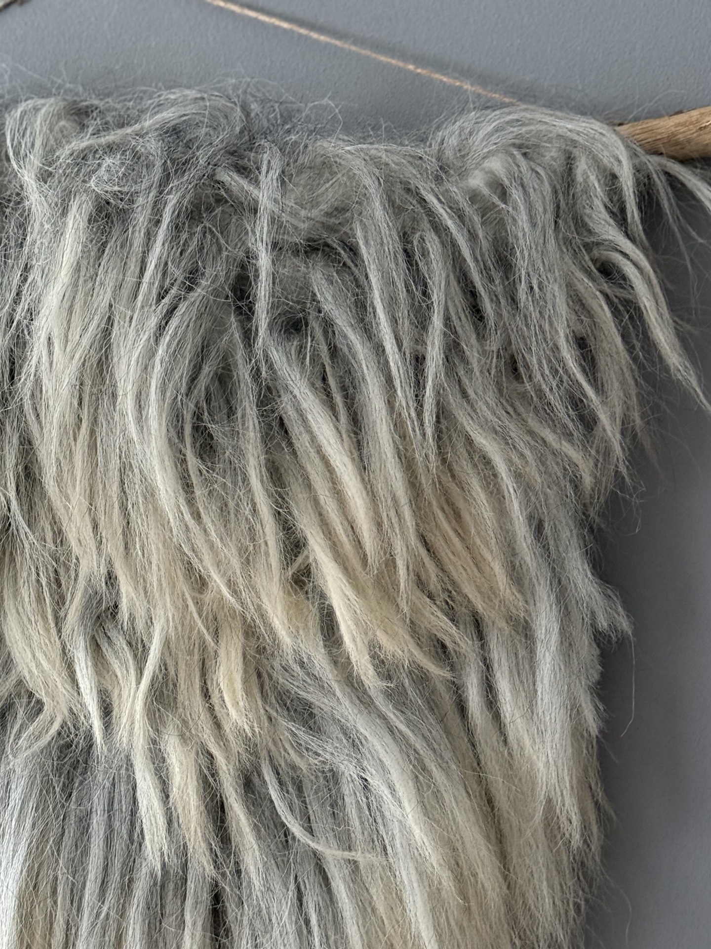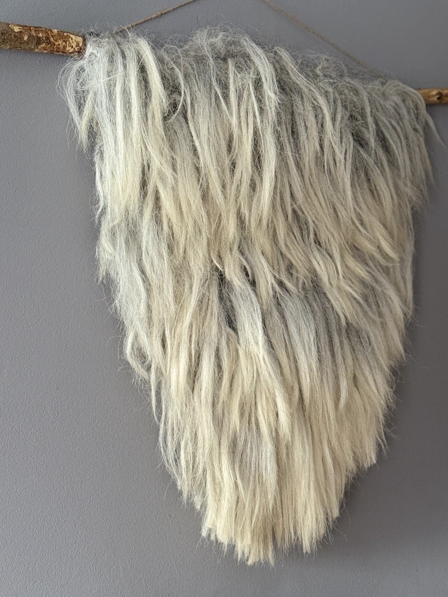 Wandhanger in L/XL formaat. Stok heeft een breedte van 110 cm. Hoogte van de vacht is ruim 80 cm. vanaf de stok tot onderzijde vacht. Wol wit en grijs tinten, echt een volle vacht met dikke lokken. Je kunt nog kiezen voor de afwerking uit een ketting of touw, deze keuze staat nog open. Ketting keuze is zwart of brons kleur. Let op! Bij verzending geldt een toeslag i.v.m. lengte van het pakket. Te bezichtigen op afspraak in Wedde (Gr.)