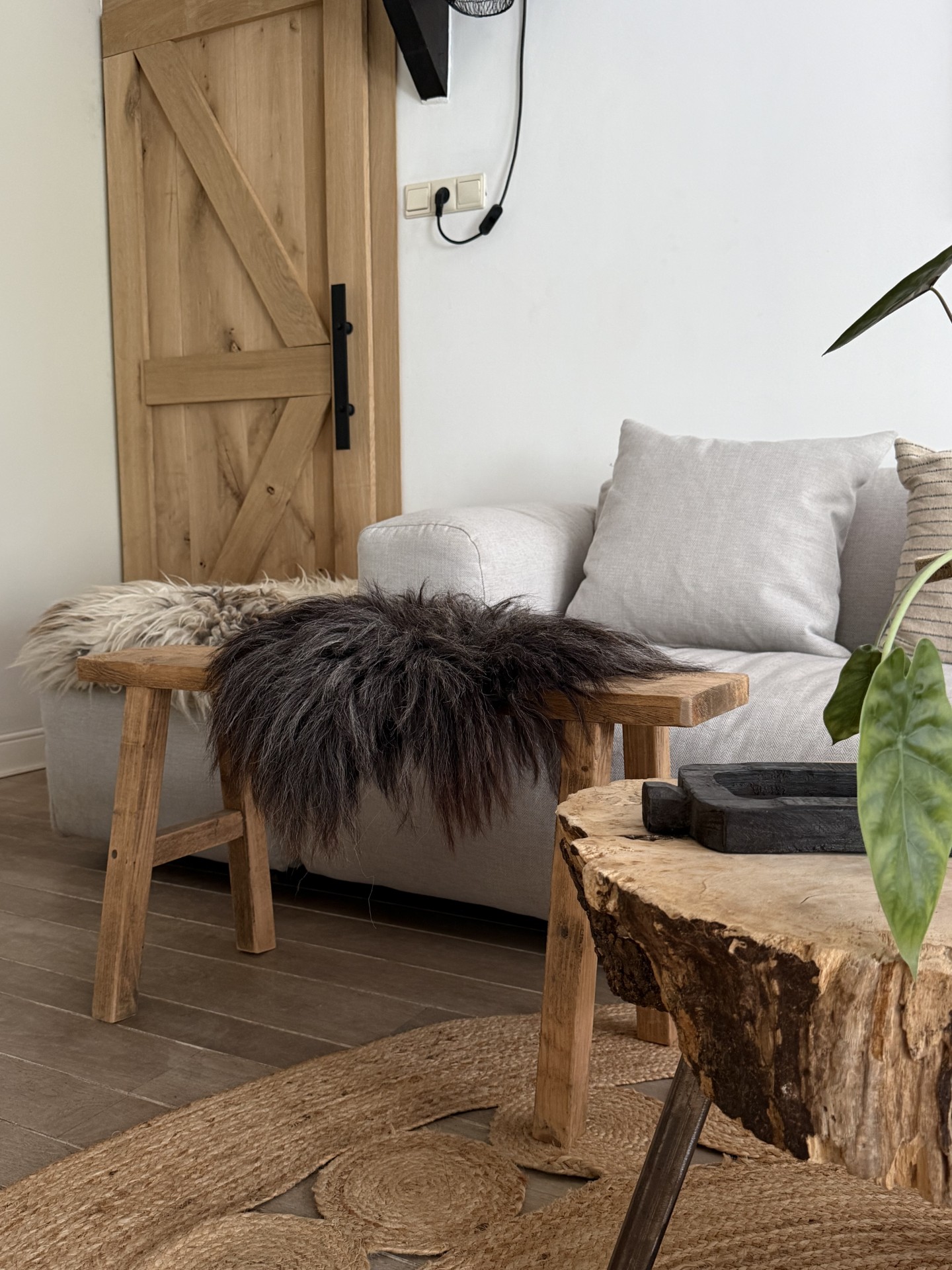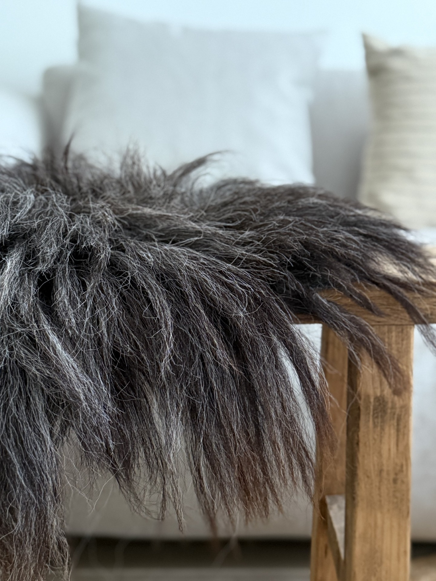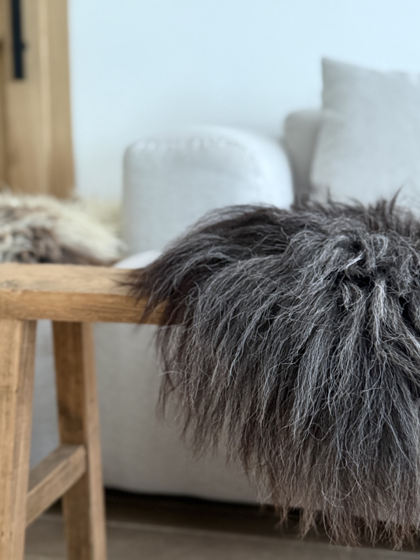 Super leuk deco vachtje in bruin en grijstinten. Niet helemaal rond qua afmeting, deze is 60 x 50 incl. de lokken. Een gevilte vacht, waarvan de wol afkomstig is van het Heidschnucke ras. Wol geschikt voor decoratief gebruik.