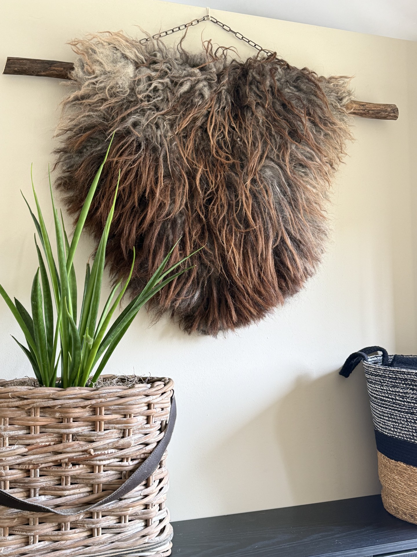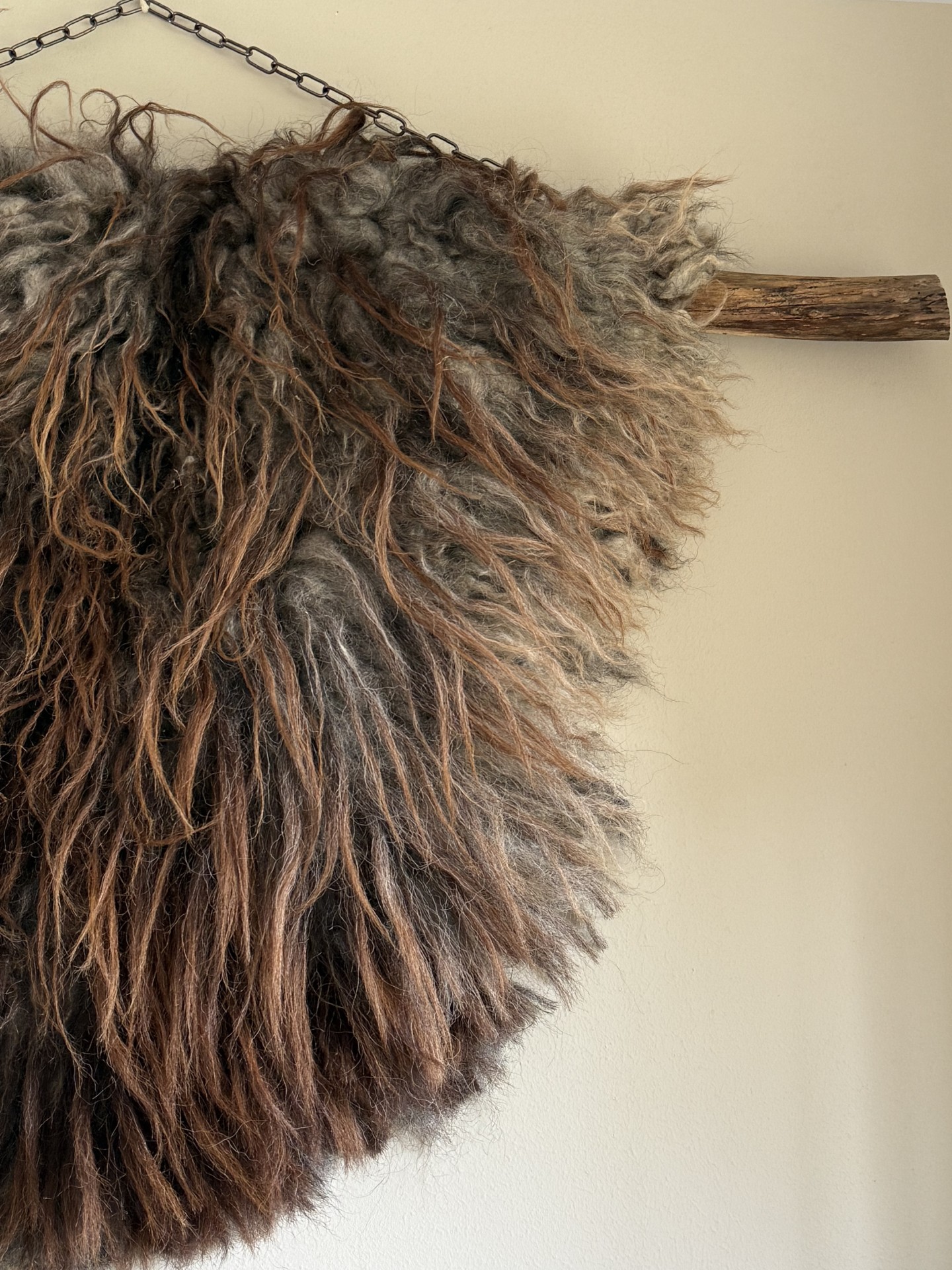 Kleuren mix van koperbruin, creme en grijs tinten. Geschoren wol afkomstig van een Heidschnucke schaap, eerste jaars wol en hierdoor mega zacht. Ketting van de hanger is makkelijk langer en korter te maken, de stok is 85 cm. breed. De lengte van de wandhanger is 65 cm. gemeten vanaf de stok tot onderzijde vacht. Ophalen en verzenden mogelijk.
