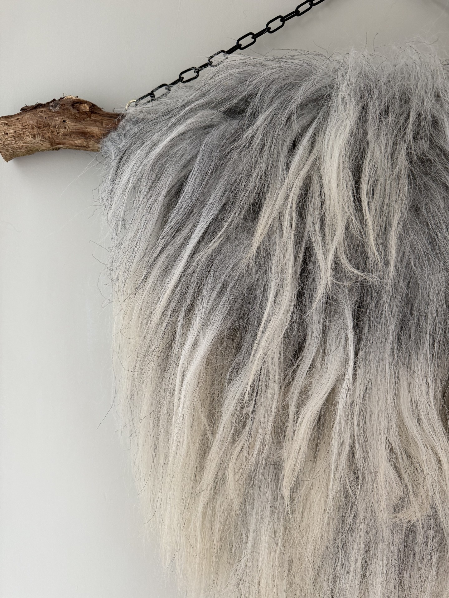 Unieke wandhanger in prachtige grijs en wol witte tinten. Lengte vacht vanaf stok tot onderzijde vacht 55 cm. De stok is 75 cm breed. Op de foto afgestyled met een zwarte ketting.