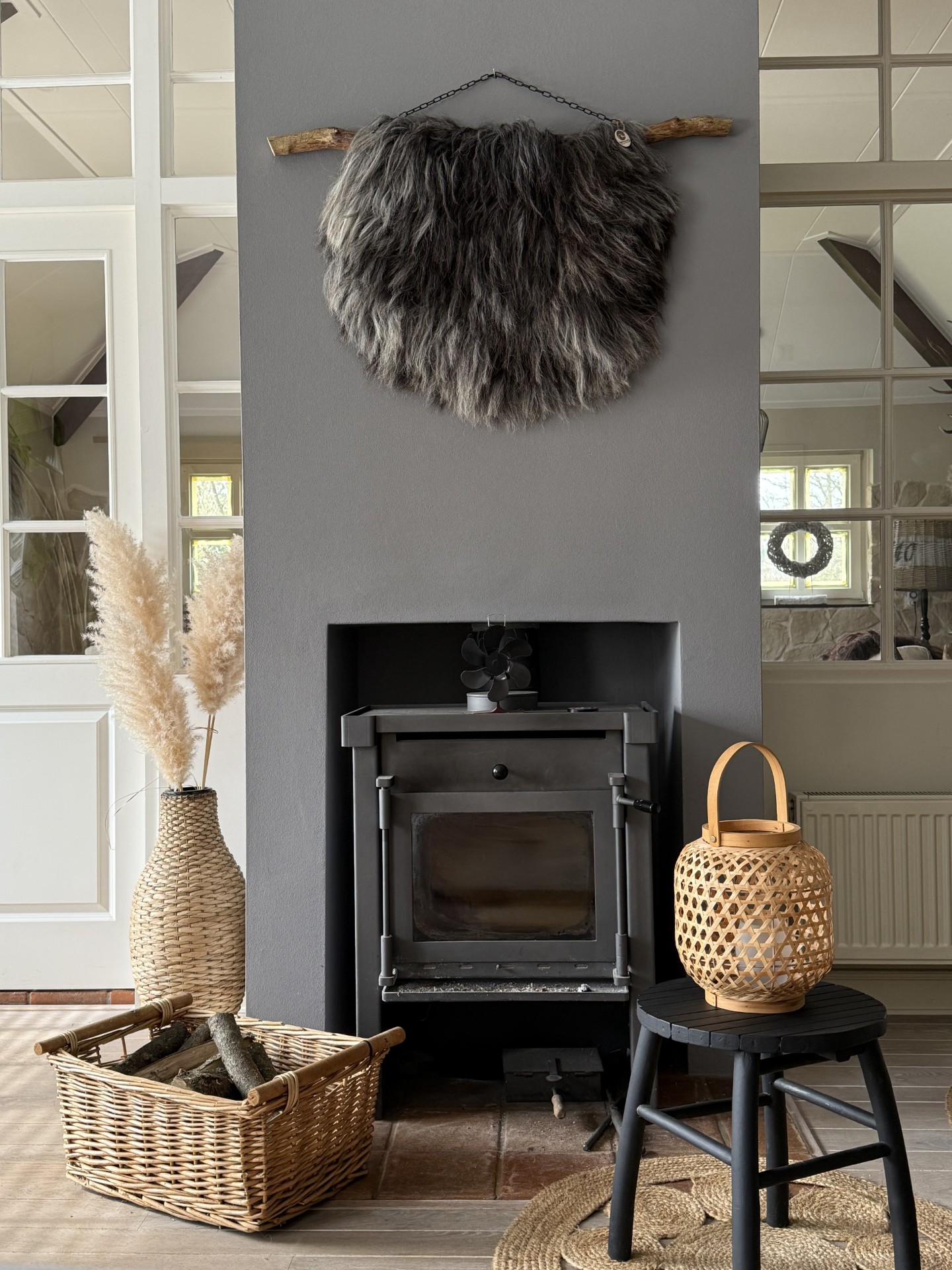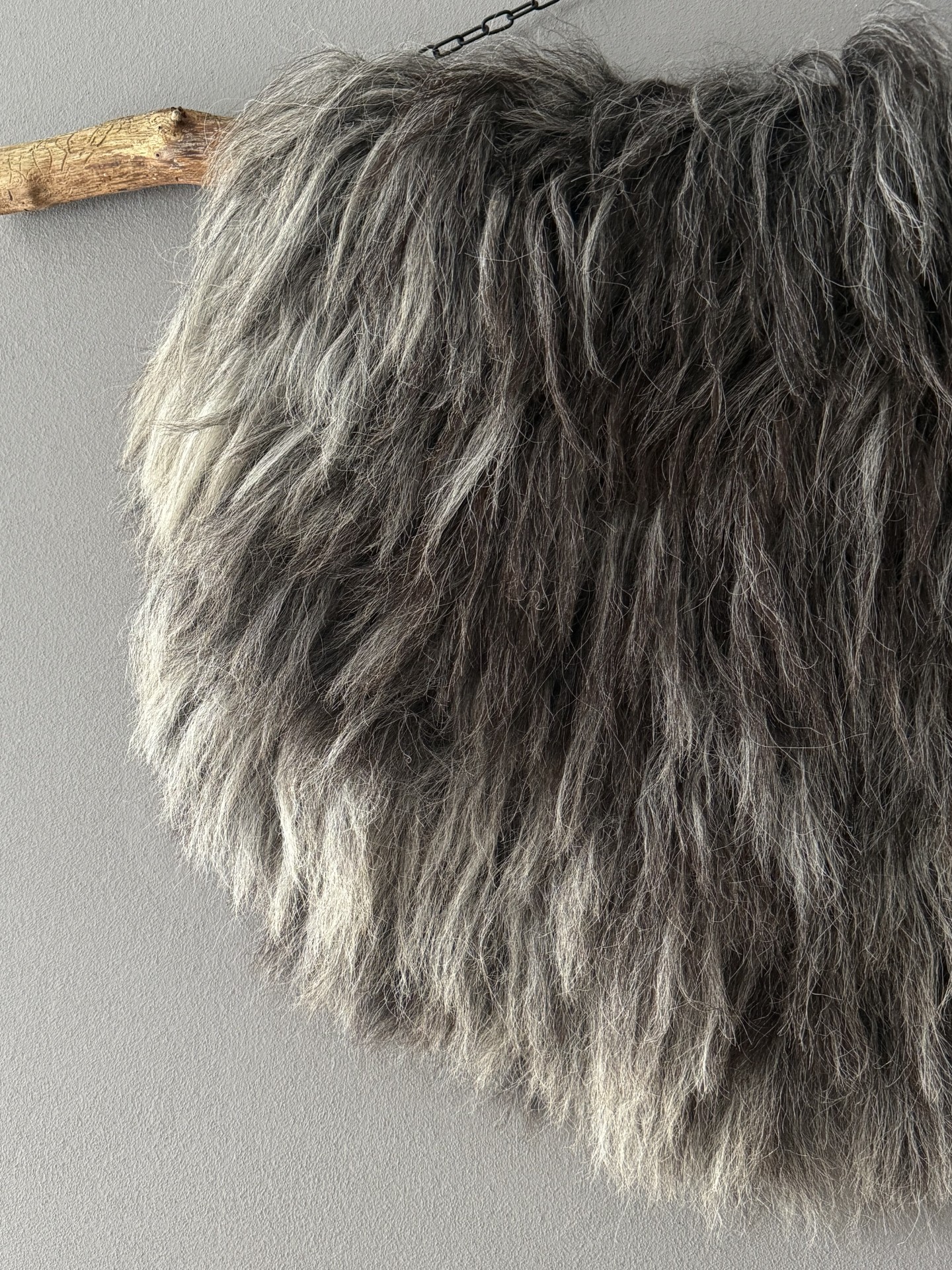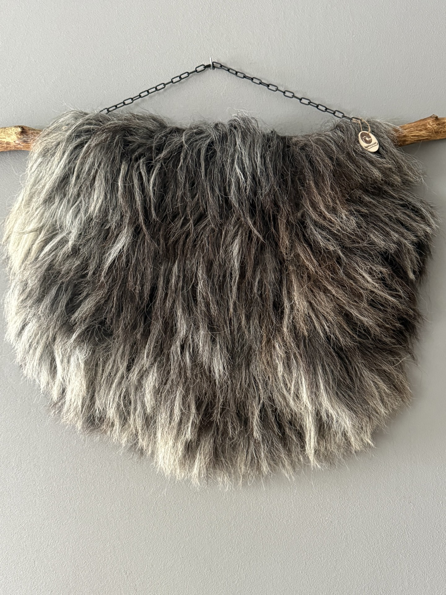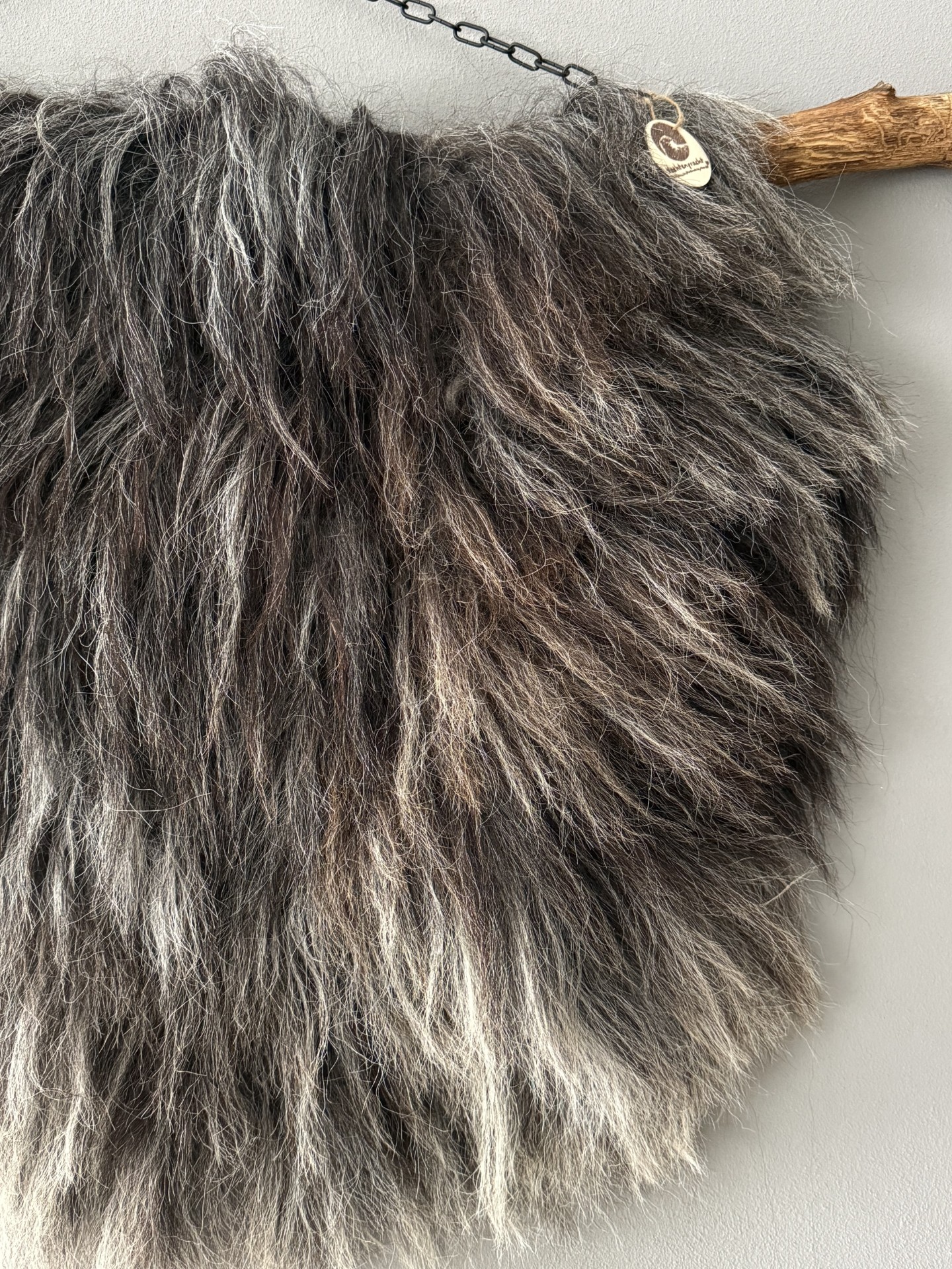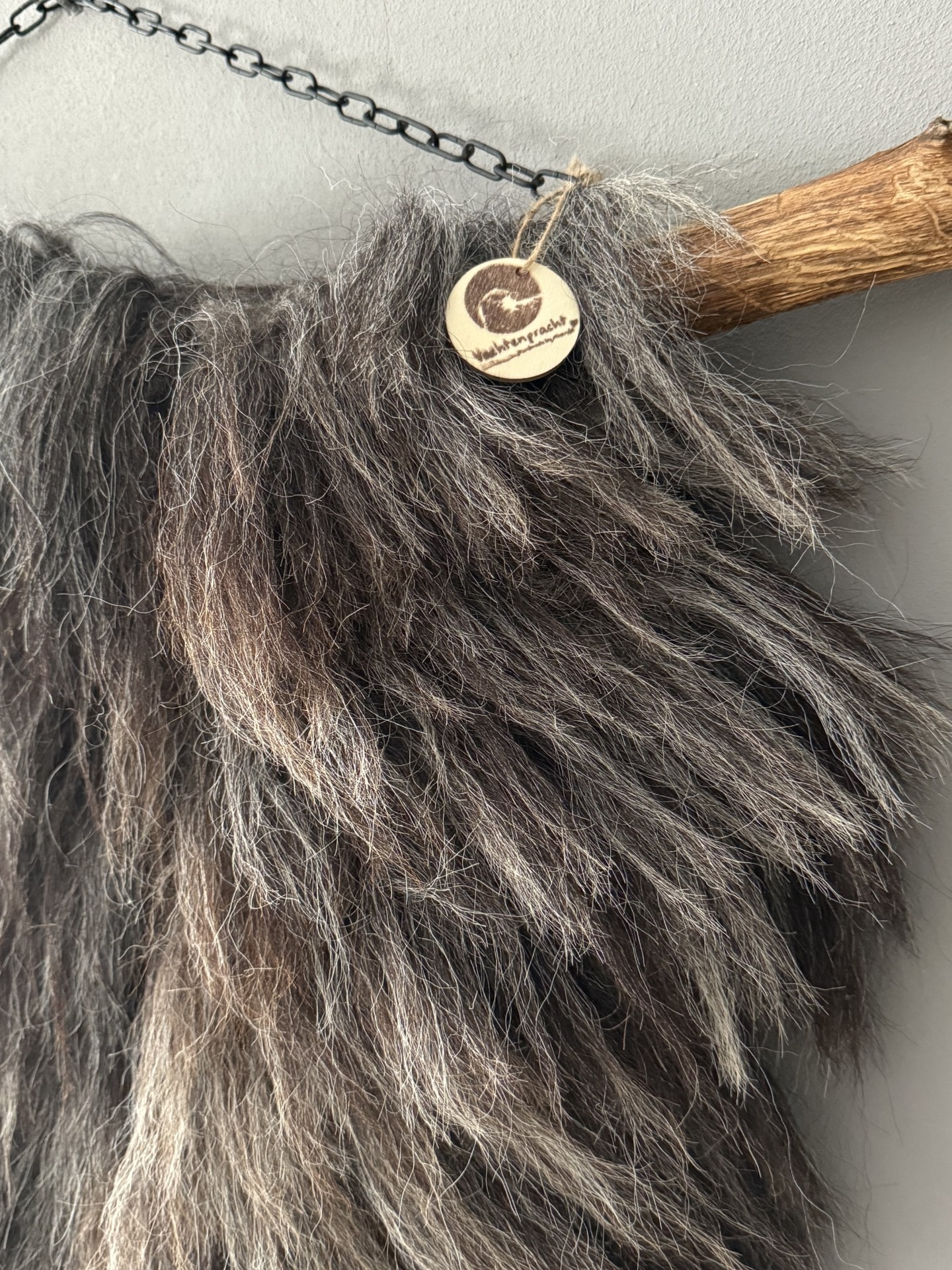 Wandhanger in bruin en grijs tinten. Donkere sobere kleuren!. Stok is 98 cm lang. Zwarte ketting, in lengte verstelbaar.