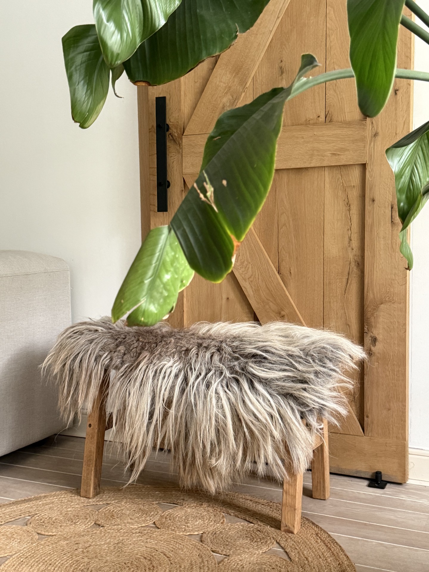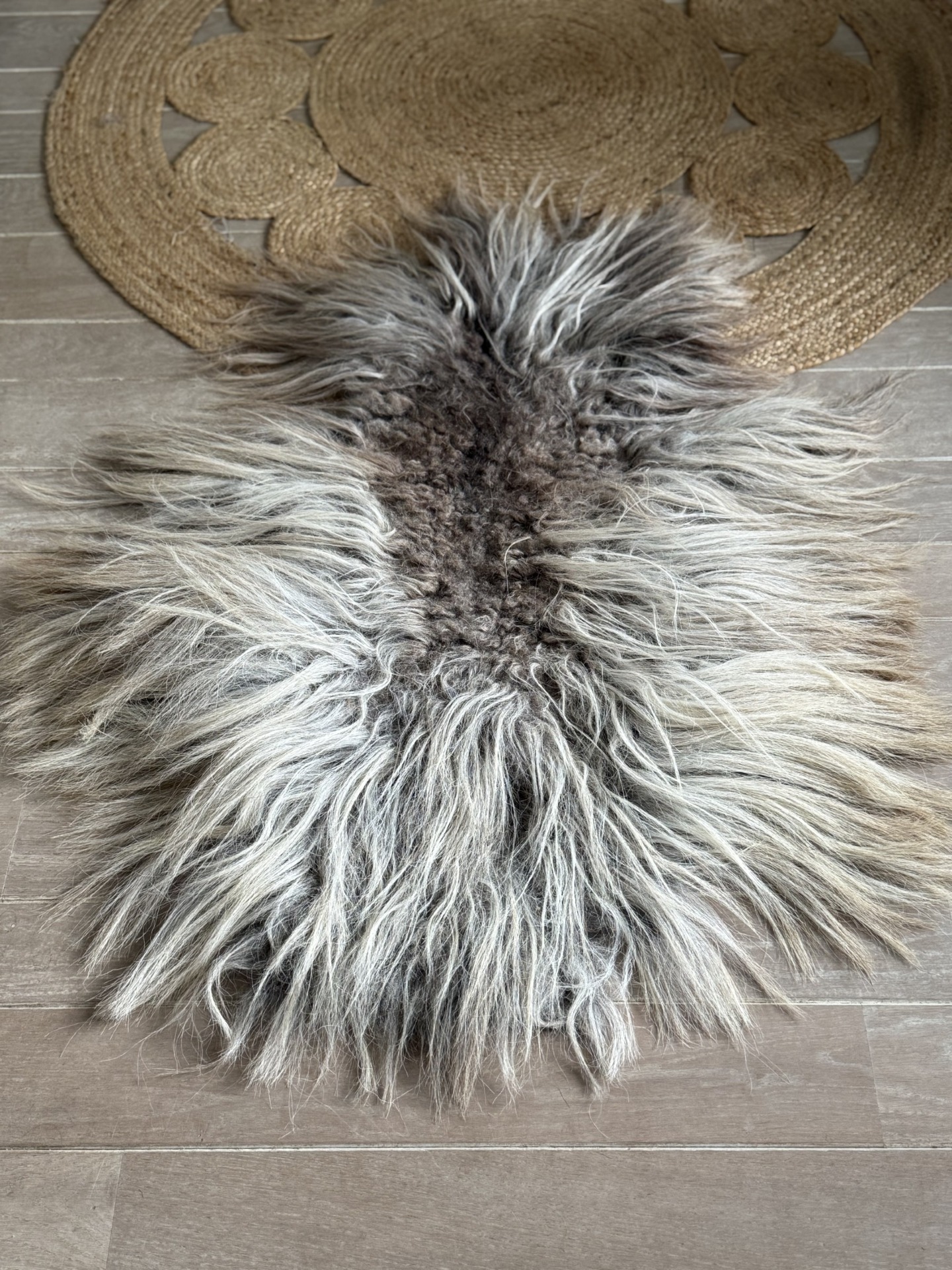 Sierlijke Heidschnucke vacht van 110 x 95 cm. Aan de buitenzijde mooie lang lokken, midden deel heeft kortere haren. Geschoren wol die gevilt is op een wollen onderlaag, je vacht is hiermee leervrij. Bruin en beige tinten.